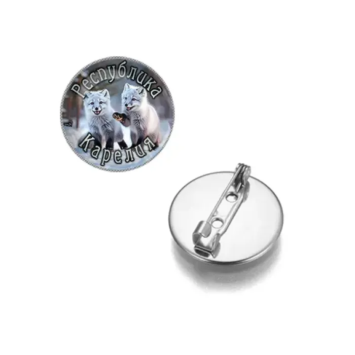 Круглый значок с изображением Республики Карелия из бижутерного сплава с серебряным покрытием и стеклянной линзой.