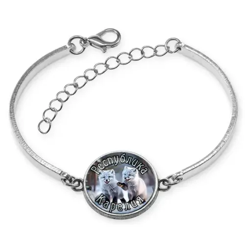 Металлический браслет-сувенир с тематикой Республики Карелия. Украшен изображением под выпуклой стеклянной линзой, имеет безразмерную форму.