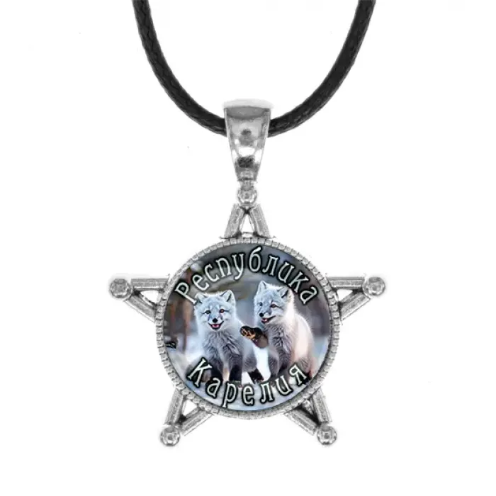 Сувенирный кулон в виде звезды из бижутерного сплава с изображением, связанным с Республикой Карелия.