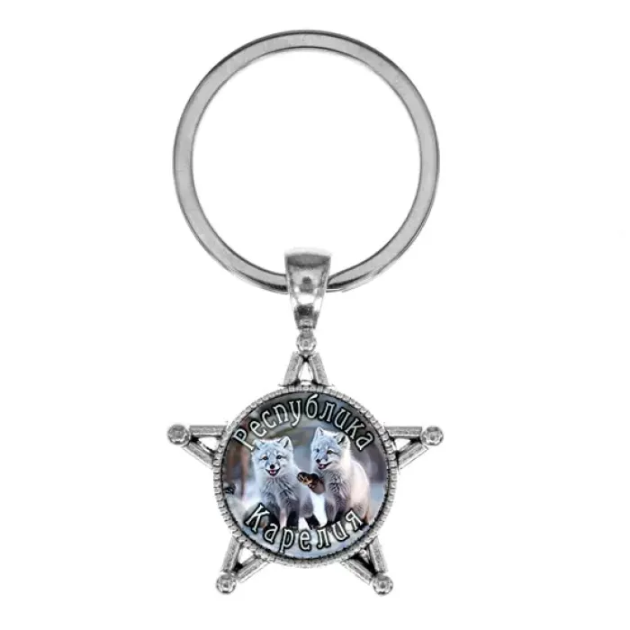 Брелок в форме звезды из бижутерного сплава с защитным стеклом и изображением, связанным с Республикой Карелия.