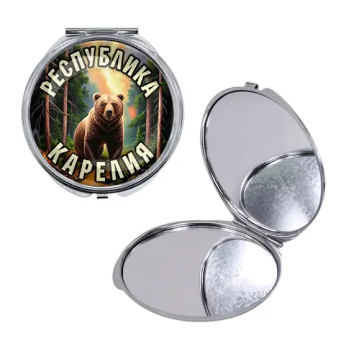 Складное зеркало круглой формы с символикой Республики Карелия на металлическом корпусе.