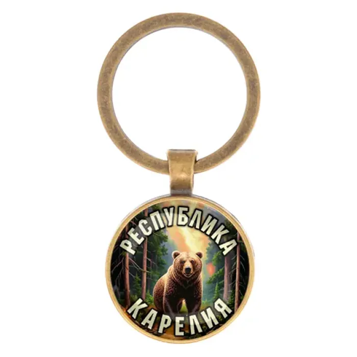 Круглый брелок из бижутерного сплава с покрытием под бронзу и стеклянной линзой, сувенир с символикой Республики Карелия.