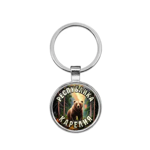 Брелок сувенирный круглой формы с изображением Республики Карелия. Материал — бижутерный сплав и стекло.