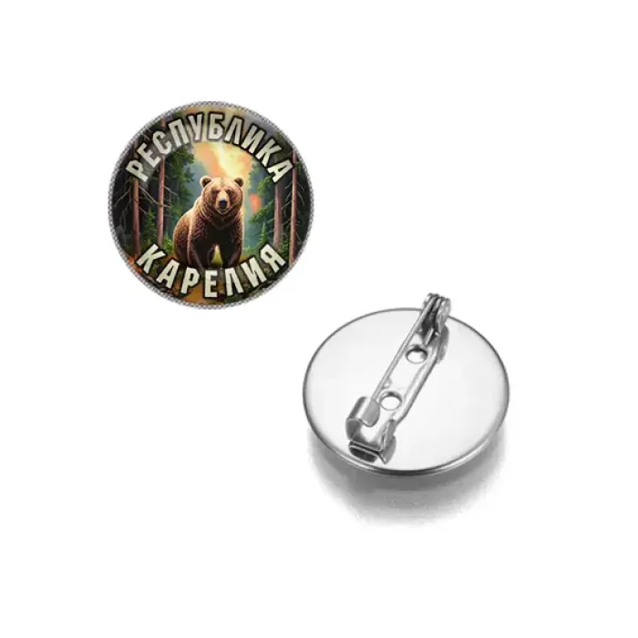 Круглый значок с изображением Республики Карелия. Изготовлен из бижутерного сплава с серебристым покрытием и защитным стеклом.