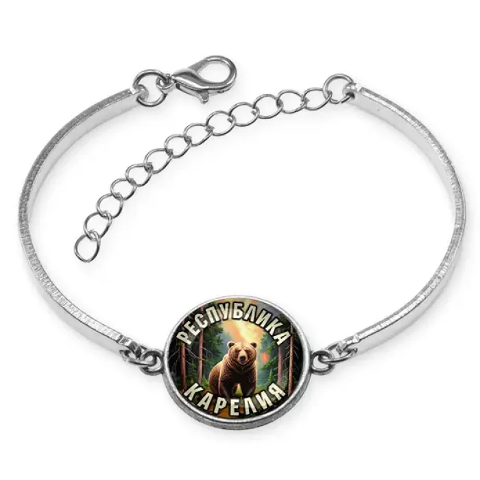 Металлический браслет с символикой Республики Карелия. Изображение под выпуклой стеклянной линзой.