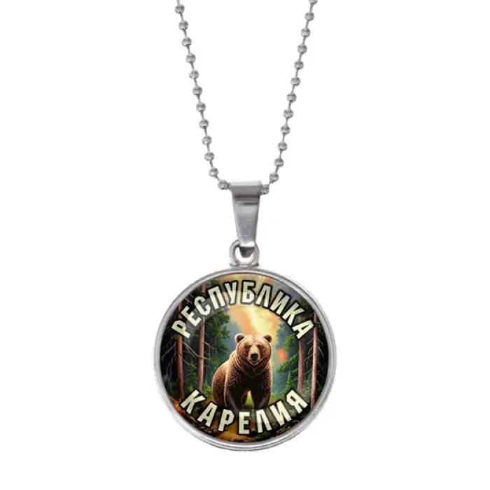 Сувенирный кулон с символикой Республики Карелия из бижутерного сплава с серебристым покрытием и стеклянной линзой.