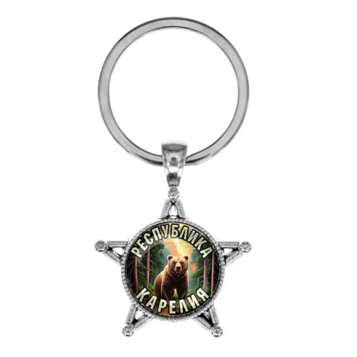 Брелок-сувенир из бижутерного сплава под серебро в форме звезды с изображением, защищённым стеклянной линзой.