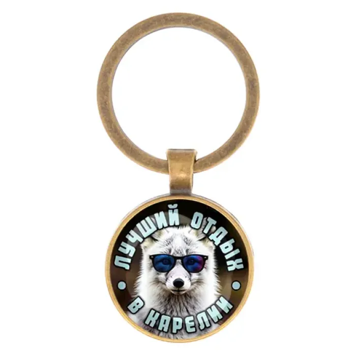 Брелок круглой формы с изображением на тему Карелии. Изготовлен из бижутерного сплава со стеклянным элементом.
