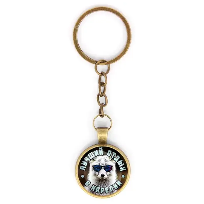 Брелок круглой формы с изображением на тему Карелии. Изготовлен из бижутерного сплава со стеклянным элементом.