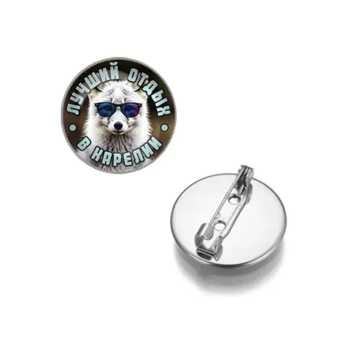 Круглый сувенирный значок с изображением, посвящённый Карелии. Материал — бижутерный сплав с серебристым покрытием и стеклянной линзой.
