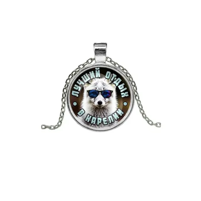 Сувенирный кулон с изображением на тему Карелии. Материал — бижутерный сплав с серебристым покрытием и стеклянной линзой.
