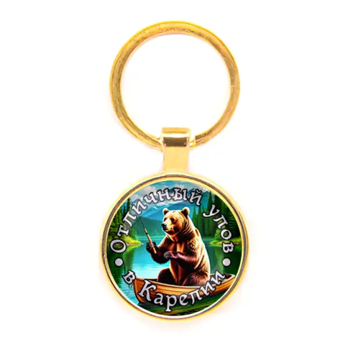 Круглый брелок для ключей из бижутерного сплава с изображением «Отличный улов в Карелии».