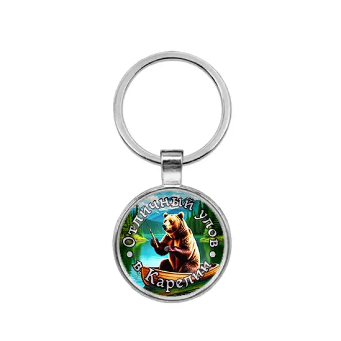 Круглый брелок из бижутерного сплава с изображением «Отличный улов в Карелии».