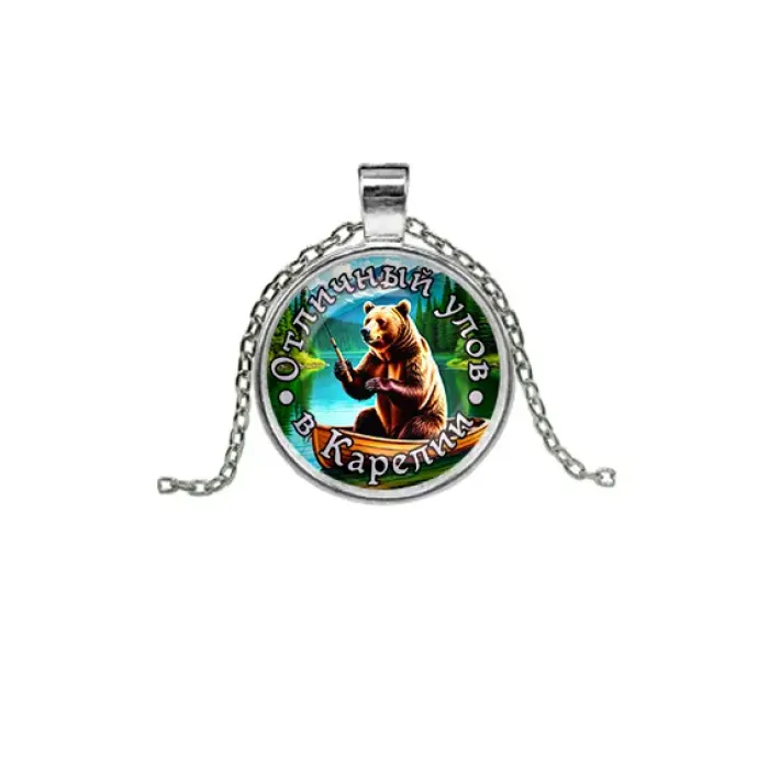 Кулон из бижутерного сплава с покрытием под серебро и стеклянным элементом. Дизайн с изображением на тему рыбалки.