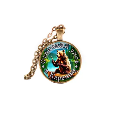 Кулон с цепочкой, выполненный из бижутерного сплава с бронзовым покрытием и стеклянной линзой. Дизайн посвящён рыбалке в Карелии.