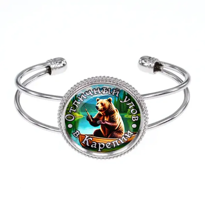 Браслет из бижутерного сплава с покрытием под серебро и стеклянной линзой. Дизайн включает изображение диаметром 25 мм.