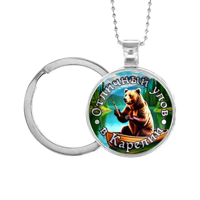 Кулон-брелок «Отличный улов в Карелии» из бижутерного сплава с покрытием под серебро и стеклянной линзой.