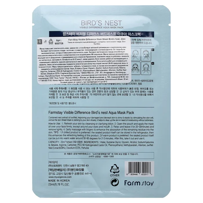Маска тканевая с экстрактом ласточкиного гнезда FarmStay VISIBLE DIFFERENCE BIRDS NEST AQUA MASK PACK 23 мл