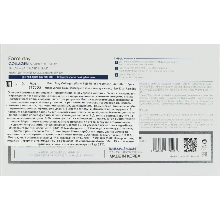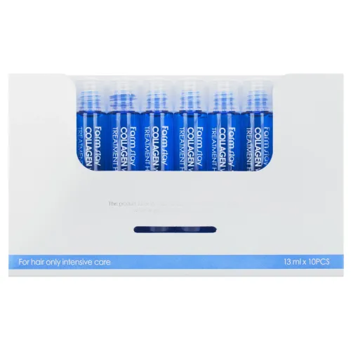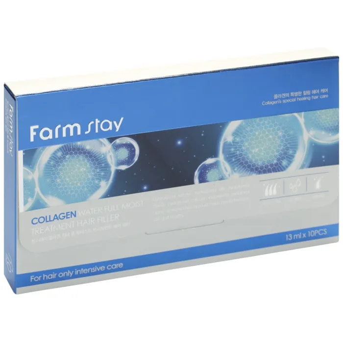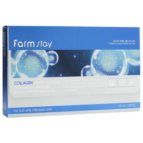 Набор филлеров увлажняющих с коллагеном для волос от FarmStay включает 10 ампул по 13 мл. Это средство предназначено для восстановления и увлажнения волос, обеспечивая их гладкость и укрепление. Основной активный ингредиент — гидролизованный морской коллаген, который восстанавливает структуру волоса изнутри и разглаживает пряди снаружи. Комплекс растительных экстрактов и компонентов морской воды способствует укреплению волос, делая их более гладкими.