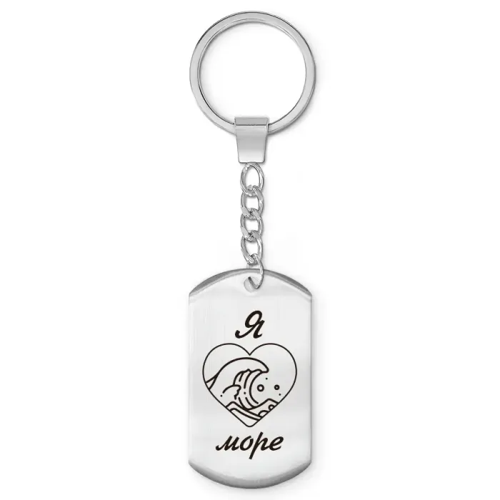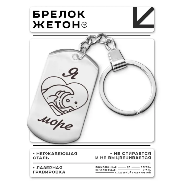 Брелок-жетон с гравировкой «Я люблю море». Изготовлен из полированной нержавеющей стали.