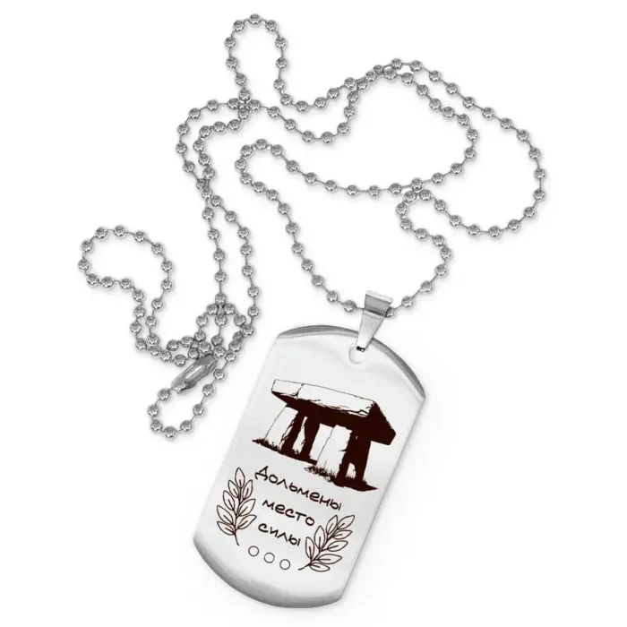 Жетон на цепочке с гравировкой «Дольмены место силы». Изготовлен из нержавеющей стали.