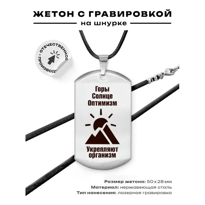 Размеры и комплектация: Размер жетона 50х28 мм. В комплекте шнурок с застёжкой. Упаковка — прозрачный пакет.