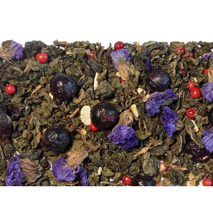 Состав: Улун, цедра лимона, мята перечная, цветки незабудки, розовый перец (горошек), ягоды чёрной смородины, натуральные ароматизаторы