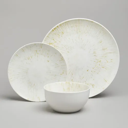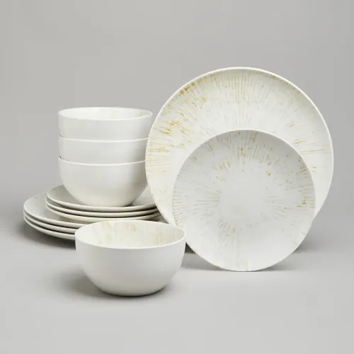 Набор изготовлен из высококачественного фарфора, безопасного для контакта с пищевыми продуктами. Посуда имеет декор в виде эффекта солнечных лучей. Конструкция предметов рассчитана на удобство ежедневного использования.