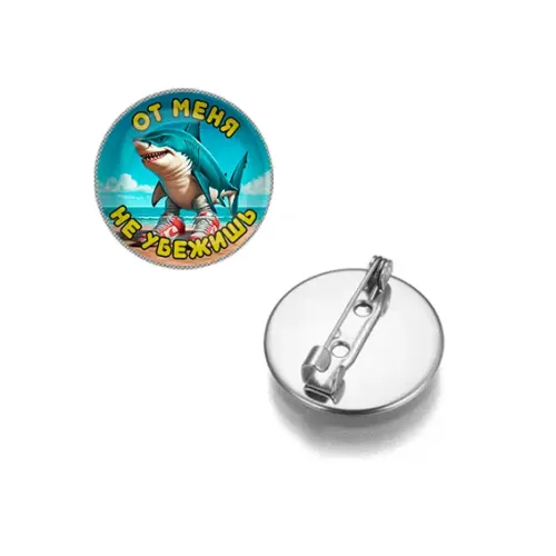 Круглый значок из бижутерного сплава с серебристым покрытием и выпуклой стеклянной линзой.