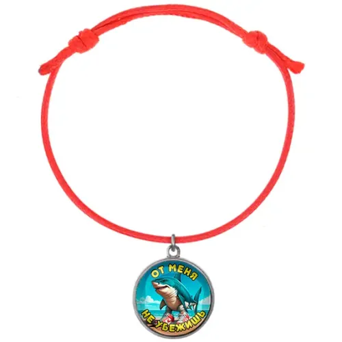 Браслет из шнура красного цвета с металлической подвеской, содержащей полиграфическую вставку под стеклом.