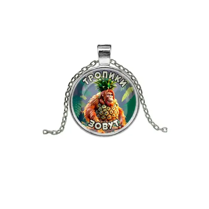 Кулон из бижутерного сплава в виде ананаса с изображением орангутана под выпуклой стеклянной линзой.