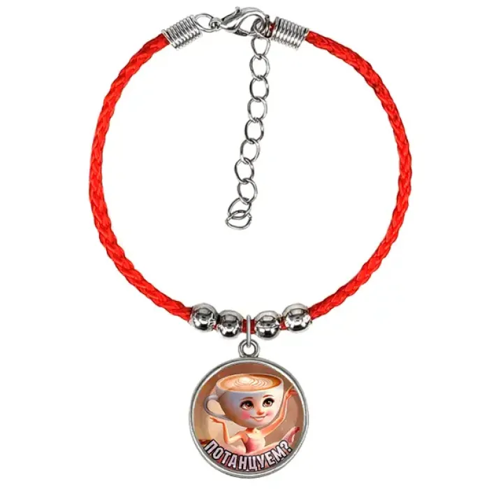 Браслет из красного шнура с металлической основой и изображением под выпуклым стеклом.