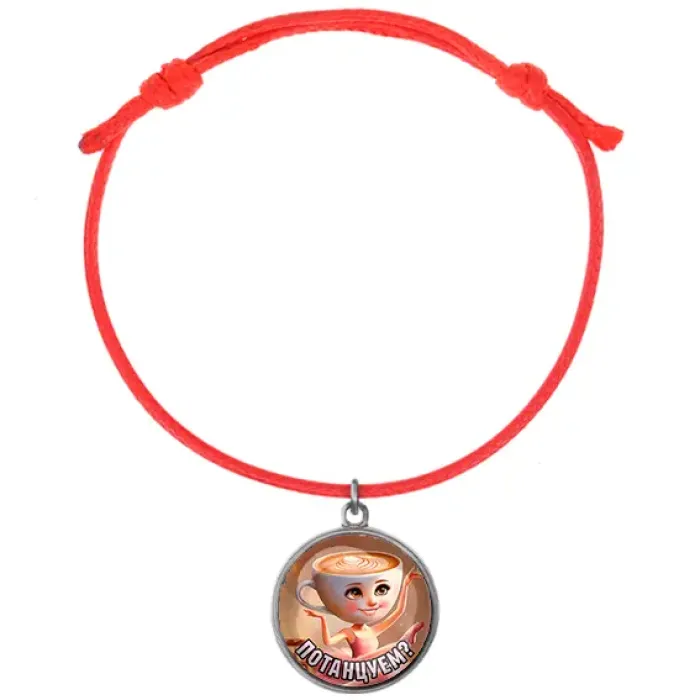 Браслет из красного шнура с металлической подвеской. Подвеска имеет полиграфическую вставку под выпуклым стеклом.
