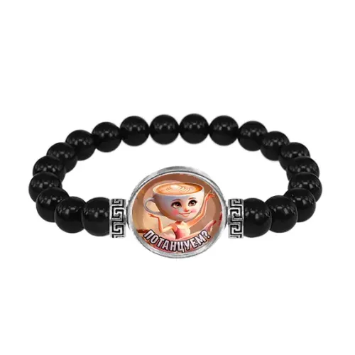 Стрейч-браслет из натурального черного агата с декоративным элементом под стеклянной линзой.