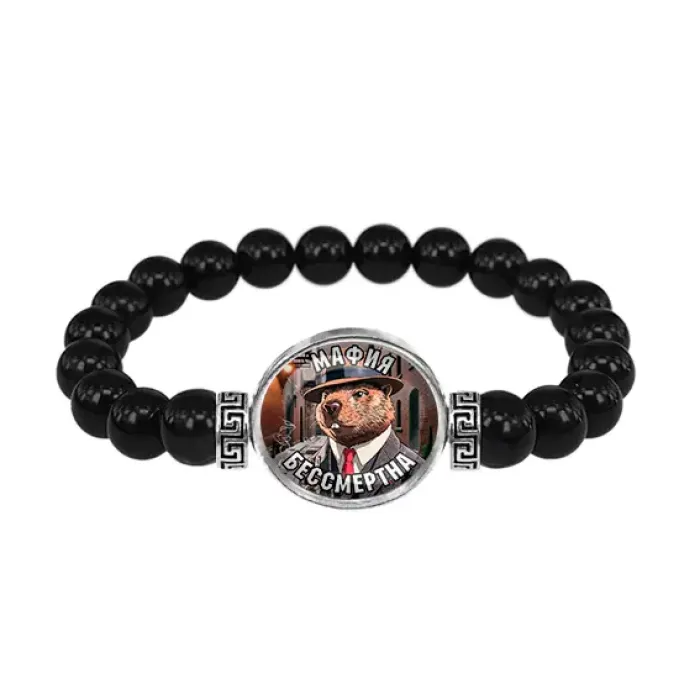 Стрейч-браслет из натурального черного агата с декоративным элементом под стеклянной линзой.