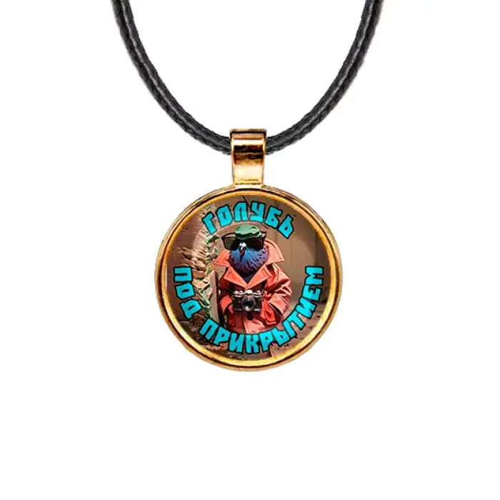 Кулон из бижутерного сплава со шнурком. Модель Шпиониро Голубиро с изображением под выпуклой стеклянной линзой.