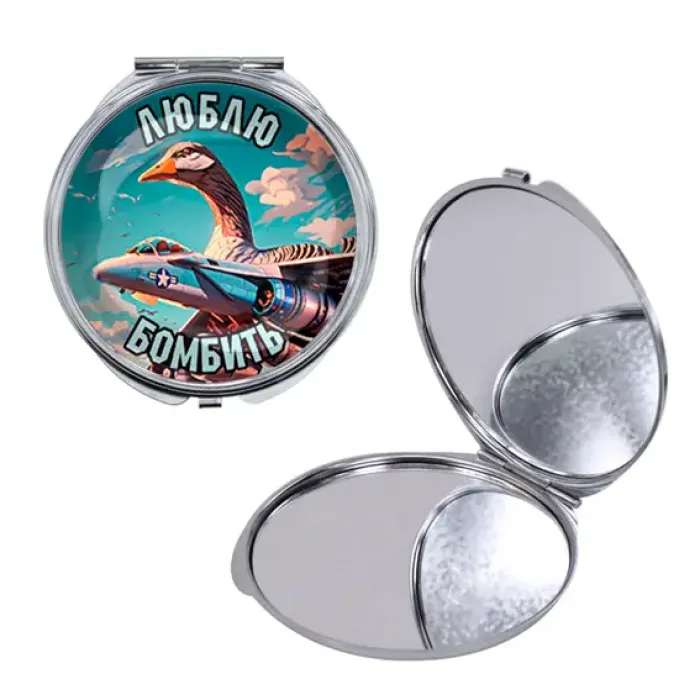 Складное зеркало для косметического набора круглой формы из металла и стекла с полноцветным изображением.