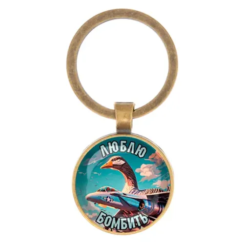 Круглый брелок из бижутерного сплава с бронзовым покрытием и выпуклой стеклянной линзой.