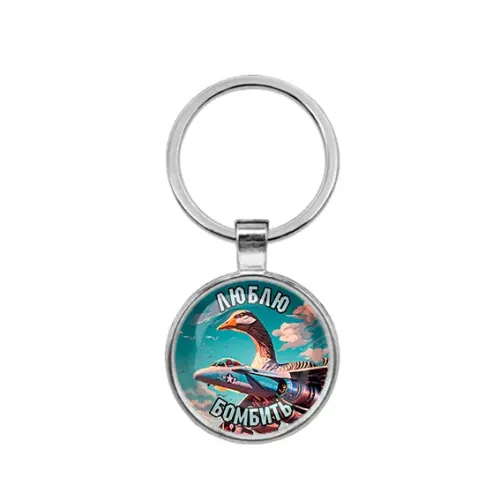 Круглый брелок из бижутерного сплава с серебристым покрытием и защитной стеклянной линзой.