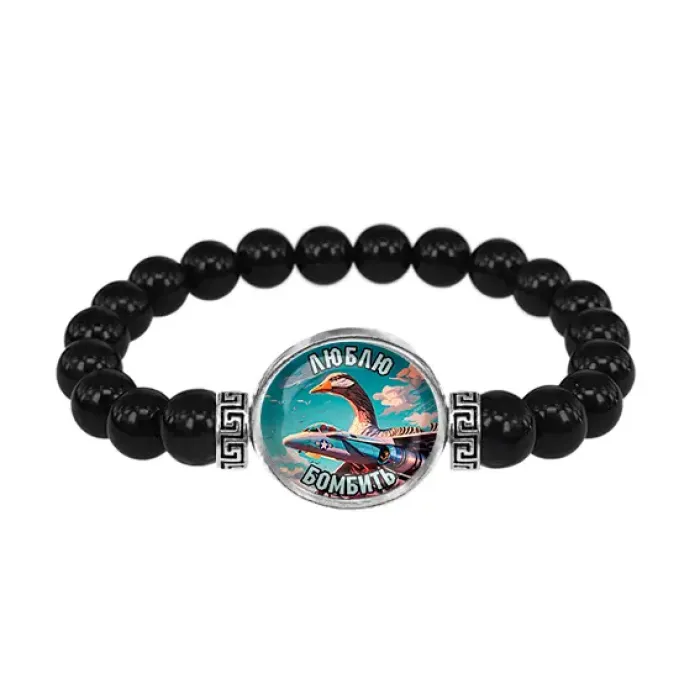 Стрейч-браслет из натурального черного агата с декоративным элементом под стеклянной линзой.