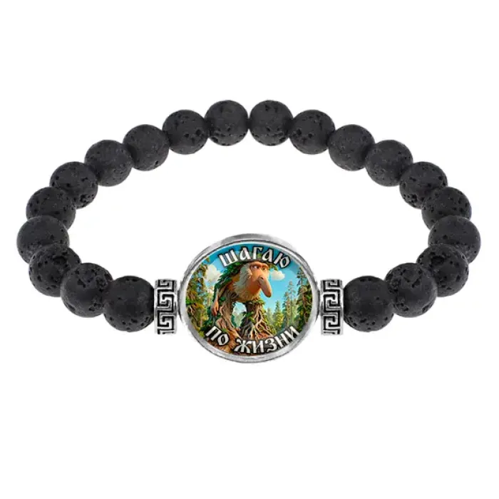 Стрейч-браслет из натуральной лавы с бусиной диаметром 8 мм и изображением под выпуклой стеклянной линзой.