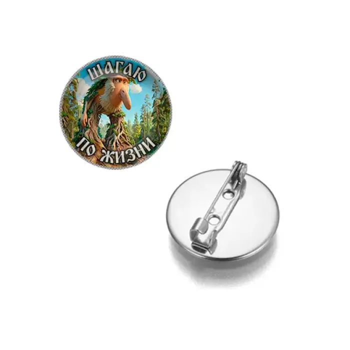 Круглый сувенирный значок из бижутерного сплава с серебристым покрытием и стеклянной линзой.