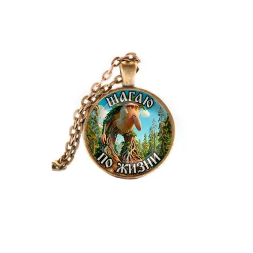 Кулон в бронзовом цвете с цепочкой. Изготовлен из бижутерного сплава с покрытием под бронзу и стеклом.