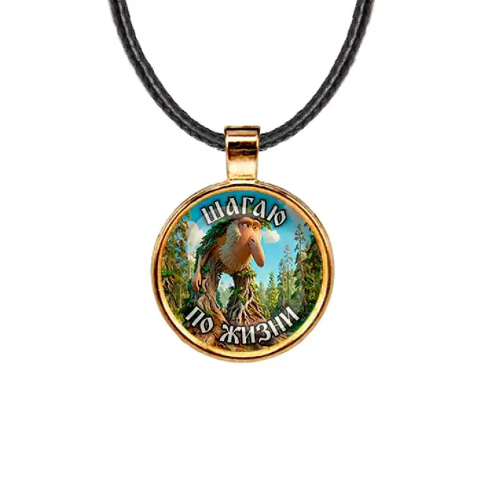Кулон из бижутерного сплава в золотом цвете со шнурком и изображением под выпуклой стеклянной линзой.