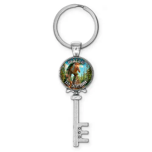 Брелок-сувенир в форме ключа из бижутерного сплава с серебристым покрытием и защитной стеклянной линзой.