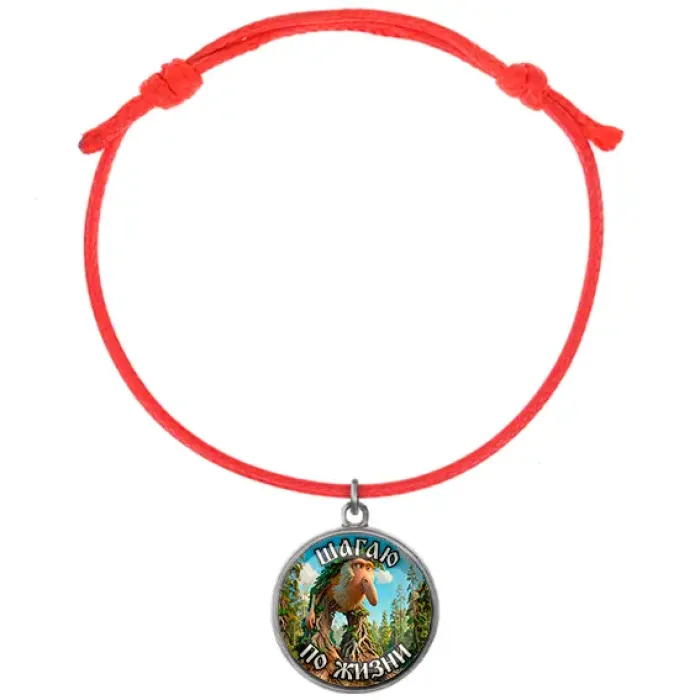 Браслет из красного шнура с металлической подвеской.