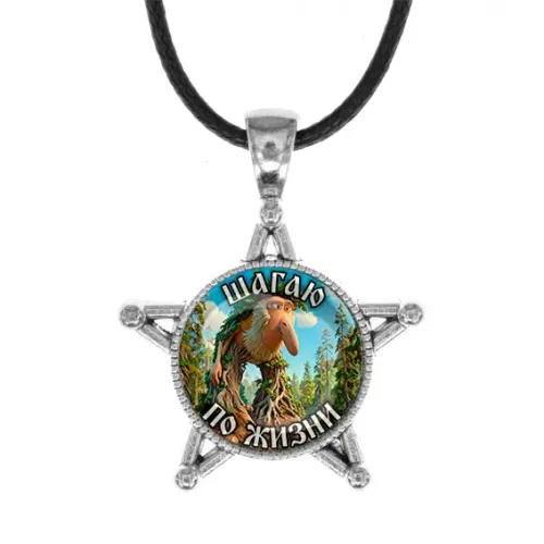 Металлический кулон в форме звезды с изображением персонажа. Изготовлен из бижутерного сплава и стекла.