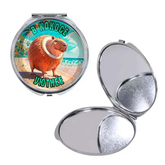Складное зеркало круглой формы из металла и стекла с полноцветным изображением на металлической части.