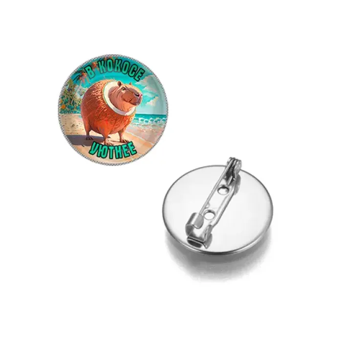 Круглый значок из бижутерного сплава с серебристым покрытием и стеклянной линзой.