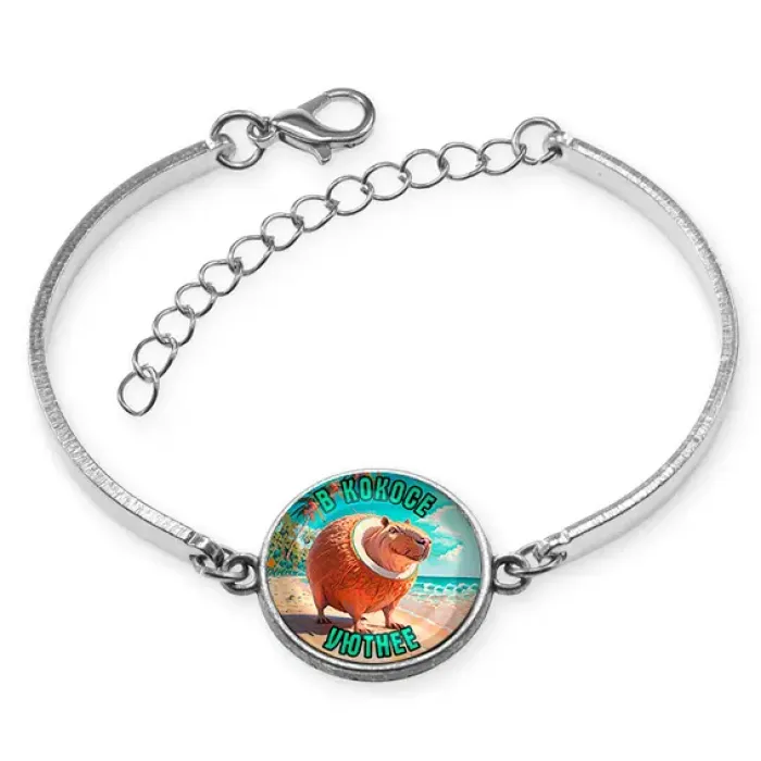 Металлический браслет в цвете серебра с декоративным элементом под стеклянной линзой.